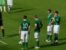 A limited edition grey shirt was used just once, in a match against Wales on 17 November 2007.[85] A black jersey with a green stripe across the chest was worn in the final game of the 2011 Nations Cup against Scotland and in a friendly against Italy in Liège, Belgium.[86][87]