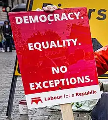 Labour for a Republic is a republican pressure group of Labour Party members and supporters,[59] founded by Labour activist Ken Ritchie in May 2011. It held its first meeting in 2012.[60][61] It has since held fringe meetings, other informal meetings, and appeared in the media on a few occasions. As of September 2022, its chairman is Nick Wall.[62] The organisation held a fringe event at the Labour Party's annual conference on 25 September 2022, which attracted large crowds, and included The Guardian's columnist Polly Toynbee, author Paul Richards, and expert in constitutional law Dr Adam Tucker as panellists.[62] In response to the Labour Party's decision to sing "God Save the King" at the conference, panellists and those who attended the event said they did not want to see it booed or heckled. It was reported that the singing was not disrupted, and that the minute of silence for the recent death of Elizabeth II was observed without failure.[62] In 2023, the Labour Party added pro-democracy campaign group Republic to a list of organisations which local party branches were no longer able to affiliate.[63]