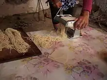 The dough for kesme usually consists of flour, water, salt, and an egg. The dough is rolled out into a large thin circle, and left to dry for a while. It is then lightly floured, folded over several times accordion-style, and sliced into strips, which are then separated. The process has been illustrated, step by step.[4] The kesme may be boiled immediately in a broth often containing ingredients such as potatoes, meat, carrots, peppers, and tomatoes, or left to harden and stored. Kesme is often made in a kazan.