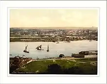 No 1 Basin was officially opened in 1871, with HMS Invincible being brought into No 5 Dock for repairs, with great ceremony.[30] Work on the other docks and basins followed, with No 3 Basin finally being completed in 1883. Two years later the project was largely complete, with facilities provided alongside for gun mounting and mast rigging, as well as a victualling depot and a coaling area.[20] Much of the excavation and building work had been done by convict labour (a convict prison having been built to the north of the dockyard, with the expansion project in mind, in 1853).[31] In 1897 a naval barracks was built on the site of the prison to provide crew accommodation for ships anchored in The Nore; for the next sixty years it served as the headquarters of Nore Command, whose Commander-in-Chief was accommodated in the adjacent Admiralty House.[20]