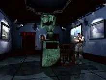 Several of the Resident Evil mansion's pre-rendered backdrops were inspired by The Overlook Hotel, the setting for the 1980 horror film, The Shining.[23] Mikami also cited the 1978 film Dawn of the Dead as a negative inspiration for the game.[lower-alpha 3][24][25] The game was initially conceived as a fully 3D first-person update of Sweet Home (influenced by the game's first-person battles), with action and shooting mechanics. A first-person prototype was produced, and initially featured a supernatural, psychological Japanese horror style similar to Sweet Home, before opting for an American zombie horror style influenced by George Romero films. During production, Mikami discovered Alone in the Dark (1992), which influenced him to adopt a cinematic fixed-view camera system. Mikami said that, if it wasn't for Alone in the Dark, Resident Evil would have had a first-person view instead.[11][26] Mikami was initially reluctant to adopt Alone in the Dark's fixed-view camera system, saying it "had an effect on immersion, making the player feel a bit more detached", but eventually adopted it because the use of pre-rendered backdrops allowed a higher level of detail than his fully 3D first-person view prototype, which "didn't get along so well with the original PlayStation's specs."[13] A concept art claimed to be of the original first-person prototype has been available since the 1990s, showing more similarity to Doom rather than Alone in the Dark.[27] A first-person perspective was not used again for the mainline Resident Evil series until Resident Evil 7: Biohazard (2017).[28]