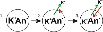 - In panel 2 of the diagram, the cell membrane has been made permeable to potassium ions, but not the anions (An−) inside the cell. These anions are mostly contributed by protein. There is energy stored in the potassium ion concentration gradient that can be converted into an electrical gradient when potassium (K+) ions move out of the cell. Note that potassium ions can move across the membrane in both directions but by the purely statistical process that arises from the higher concentration of potassium ions inside the cell, there will be more potassium ions moving out of the cell. Because there is a higher concentration of potassium ions inside the cells, their random molecular motion is more likely to encounter the permeability pore (ion channel) that is the case for the potassium ions that are outside and at a lower concentration. An internal K+ is simply "more likely" to leave the cell than an extracellular K+ is to enter it. It is a matter of diffusion doing work by dissipating the concentration gradient. As potassium leaves the cell, it is leaving behind the anions. Therefore, a charge separation is developing as K+ leaves the cell. This charge separation creates a transmembrane voltage. This transmembrane voltage is the membrane potential. As potassium continues to leave the cell, separating more charges, the membrane potential will continue to grow. The length of the arrows (green indicating concentration gradient, red indicating voltage), represents the magnitude of potassium ion movement due to each form of energy. The direction of the arrow indicates the direction in which that particular force is applied. Thus, the building membrane voltage is an increasing force that acts counter to the tendency for net movement of potassium ions down the potassium concentration gradient.