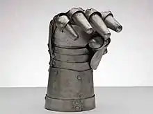 - A metal gauntlet (also known as The Glove and jokingly dubbed the Risen Mitten by Ianto Jones) with the ability to bring the dead back to life for a limited time, as seen in "Everything Changes". The glove fell through the rift circa 1967 and rested on the bottom of Cardiff Bay until Torchwood Three dredged it in early 2007.[22] It has a strange but unspecified connection to a knife made of the same metal. The Torchwood Institute website details the testing of the glove, and that Suzie was buying goldfish in bulk and killing them to test the Glove.[23] Suzie's research showed that the glove was slightly radioactive and that the glove possesses "low psych levels" which allows it to directly respond to brain activity.[14] It was later established it has an empathic link with its wearer, like "a rope from [the] heart to the glove" and that transfers the life force of the wearer to keep the dead alive. The Glove is more effective on recent, violent trauma victims, prompting Suzie Costello to murder several Cardiff residents in order to improve her proficiency in using it. Following Suzie's suicide, the Glove is placed in Jack's safe and sealed with a "NOT FOR USE" tag.