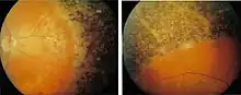Retinal degeneration is a retinopathy which consists in the deterioration of the retina[1] caused by the progressive death of its cells.[2] There are several reasons for retinal degeneration, including artery or vein occlusion, diabetic retinopathy, R.L.F./R.O.P. (retrolental fibroplasia/ retinopathy of prematurity), or disease (usually hereditary).[3] These may present in many different ways such as impaired vision, night blindness, retinal detachment, light sensitivity, tunnel vision, and loss of peripheral vision to total loss of vision.[4] Of the retinal degenerative diseases retinitis pigmentosa (RP) is a very important example.