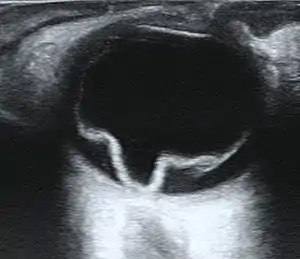 | Ultrasound of a retinal detachment in a patient presenting with complete vision loss and light perception only. | |