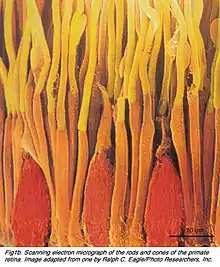 The initial retinal degenerative symptoms of retinitis pigmentosa are characterized by decreased night vision (nyctalopia) and the loss of the mid-peripheral visual field.[3] The rod photoreceptor cells, which are responsible for low-light vision and are orientated mainly in the retinal periphery, are the retinal processes affected first during non-syndromic (without other conditions) forms of this disease.[4] Visual decline progresses relatively quickly to the far peripheral field, eventually extending into the central visual field as tunnel vision increases. Visual acuity and color vision can become compromised due to accompanying loss of the cone photoreceptor cells, which are responsible for color vision, visual acuity, and sight in the central visual field.[4] The progression of disease occurs in both eyes in a similar but not identical pattern. A variety of indirect symptoms characterize retinitis pigmentosa along with the direct effects of the initial rod photoreceptor degeneration and later cone photoreceptor decline. Phenomena such as photophobia, which describes the event in which light is perceived as an intense glare, and photopsia, the presence of blinking, swirling or shimmering lights spontaneously occurring within the visual field, often manifest during the later stages of RP.