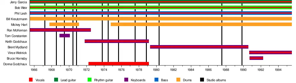 The Grateful Dead were an American rock band known for their lengthy, partially improvised performances, as well as for a loyal fan base who often followed the band for several shows or entire tours. They disbanded in 1995, following the death of de facto bandleader Jerry Garcia.[1] Since then remaining members have reunited for a number of concert tours and one-off performances, often in very different configurations. The following is a list of instances where former Grateful Dead members have reunited.