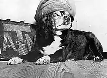 In January 1931, several members of the Fightin' Texas Aggie Band were returning from a party in nearby Navasota, Texas when they unexpectedly hit a small black and white stray mutt. They brought the dog with them, and smuggled her into Legett Hall,[2] fully intending to take her to the vet school the next day. The next morning, her presence was made apparent when "Reveille" was blown by a bugler and the dog began barking, hence Reveille became her name.[3] Although it was against the rules to keep pets in the dorms, the cadets fell in love with the dog and kept her anyway.[2]