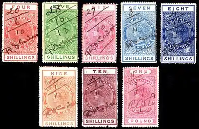 In 1880, a new design, also portraying Queen Victoria, was issued. These remained in use for over fifty years, and therefore many printings exist with different perforations, watermarks and papers. Many different denominations were issued ranging from 4d to £1000.[7] From 1 April 1882 these became valid for postal use, and postally used copies generally command higher prices than fiscally used ones.[8][9]