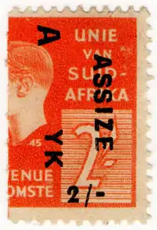 These were used to pay the annual fee for the inspection of weighing and measuring equipment such as shop scales. Many different stamps were issued between c.1920 and 1956, and all were revenue or postage stamps bisected in two (one half being for the receipt, the other for the audit duplicate), and overprinted ASSIZE (c.1920), ASSIZE IJK (c.1923-c.1930) or ASSIZE YK (c.1930-1956). All of these are very scarce or rare revenue stamps.