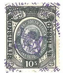The first general purpose South African revenue issue was in 1913. From that year until 1937, all South African revenues featured the profile of King George V, with changes in size and inscriptions. From 1938 to 1952 stamps featured King George VI. The original 1938 issue was reissued in bantam format in 1943, and in 1946 these were replaced by a new design still featuring the King. In 1942, Native Tax stamps were overprinted REVENUE or INKOMSTE. 1954 saw a new design featuring Queen Elizabeth II, but these were quickly replaced by an issue bearing the coat of arms later that year. These were used reissued denominated in rand in 1961, and were replaced by a numeral issue in 1968. These remained in use until a new design, also a numeral, appeared in 1978. These were finally withdrawn in March 2009.[2]