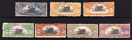 In 1941, a new set was issued inscribed REVENUE DUTY W.A. This also showed the swan, but the design was now smaller. Initially five values from 1d to 1/- were issued, but new values continued to be issued, the highest being the £10 in 1951 and in 1963. This set remained in use until the Australian dollar was adopted in 1966. From that year until 1973, a large set of sixteen values from 1c to $50 was issued. Each value had a different wildlife design.