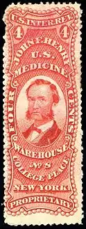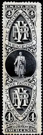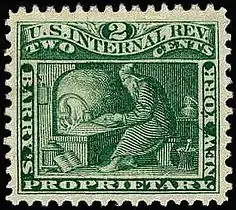 By 1875 the Internal Revenue awarded the contract to print for revenue stamps to the National Bank Note Company who prepared a second series of proprietary stamps. The new revenue stamps are commonly referred to as the "second proprietary issue," and occur in 1-cent, 2-cent, 3-cent, 4-cent, 5-cent, and 6-cent denominations. Use of revenue stamps to pay proprietary taxes ended on July 1, 1883.[20]