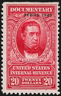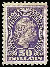 During the period from 1940 to 1958 the Department of Internal Revenue released several hundred, Documentary, revenue stamps in three basic designs with denominations that ranged from 1-cent to 10,000-dollars and with a variety of different portraits of notable statesmen, each denomination of stamp bearing a different portrait. Almost all of the issues of this period were printed in "carmine" red. The higher denominations of 30-dollars to 10,000-dollars bore a unique serial number as an added security measure. A few reprints from 1917 were also issued during this period.[33]