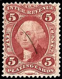 The first revenue stamps in the United States were used briefly during colonial times, among the most notable usage involved the Stamp Act. Long after independence, the first revenue stamps printed by the United States government were issued in the midst of the American Civil War, prompted by the urgent need to raise revenue to pay for the great costs it incurred. After the war ended however, revenue stamps and the taxes they represented still continued. Revenue stamps served to pay tax duties on items that came under two main categories, Proprietary and Documentary. Proprietary stamps paid tax duties on goods like alcohol and tobacco, and were also used for various services, while Documentary stamps paid duties on legal documents, mortgage deeds, stocks and a fair number of other legal dealings. Proprietary and Documentary stamps often bore these respective designations, while in several of the issues they shared the same designs, sometimes with minor variations. Beginning in 1862 the first revenue stamps were issued, and would continue to be used for another hundred years and more. For the first twelve years George Washington was the only subject featured on U.S. revenue stamps, when in 1875 an allegorical figure of Liberty finally appeared. Revenue stamps were printed in many varieties and denominations and are widely sought after by collectors and historians. Revenue stamps were finally discontinued on December 31, 1967.
