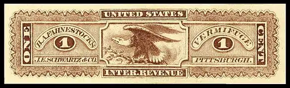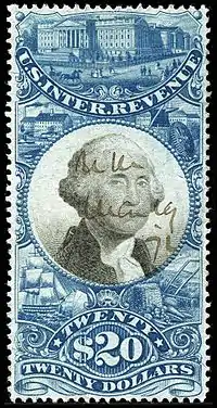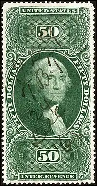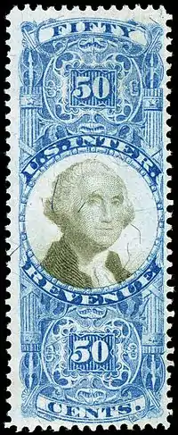In the continuation of providing funding for the Spanish–American War Congress authorized a tax on a wide range of goods and services including various alcohol and tobacco products, tea and other amusements and also on various legal and business transactions (such as Stock certificates, bills of lading, manifests, and marine insurance). To pay these tax duties revenue tax stamps were purchased and affixed to the taxable item or respective certificate.[25][26] There are seventeen stamps in this issue which occur in denominations ranging from ½-cent to 50-dollars which were printed on double lined watermarked paper. Two types of perforations were used: Rouletted perforations and 'hyphen' shaped perforations. Numerous double transfers occur (doubled image) in this issue.[27]