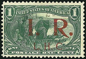 Because of shortages of revenue stamps two shipping firms operating along the Erie Canal used the existing 1c Trans-Mississippi stamp issue which was approved by the Federal District Revenue Collector who commissioned the Purvis Printing Company to do the overprinting. They were ordered by L. H. Chapman of the Chapman Steamboat Line, which operated freight-carrying steamboats along the Erie Canal, making stops at Syracuse, Utica, Little Falls and Fort Plain. Only 250 stamps were produced. In addition 250 were printed reading "I.R./P.I.D. & Son", for P.I. Daprix & Son, which served different ports along the same waterway. In each case five panes of 50 stamps were overprinted with the initials I.R..[24]