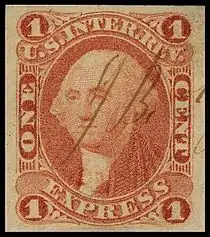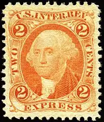 The new stamps were printed in several colors and depicted a portrait of George Washington on all thirty denominations from one-cent to $200.[6] The engraved image of Washington was modeled after a painting by Gilbert Stuart.[7] The first issues were printed on hard brittle paper and later printed on soft woven paper of varying thicknesses. Colors were generally dull for stamps printed before 1868. The stamps were issued in sheets perforated with 12 gauge perforations or 'imperforate', i.e.solid sheets with no perforations.[5] Washington remained the only figure on the dozens of varieties issued up until 1874.[8]