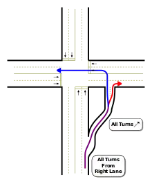 The jughandle is also known as a Jersey left due to its high prevalence within the U.S. state of New Jersey (though this term is also locally used for an abrupt left at the beginning of a green light cycle).[1] The New Jersey Department of Transportation defines three types of jughandles. "Type A" is the standard forward jughandle. "Type B" is a variant with no cross-street intersected by the jughandle; it curves 90 degrees left to meet the main street, and is either used at a "T" intersection or for a U-turn only. "Type C" is the standard reverse jughandle.[2]