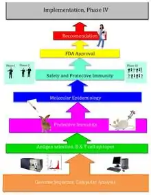 The basic idea behind reverse vaccinology is that an entire pathogenic genome can be screened using bioinformatics approaches to find genes. Some traits that the genes are monitored for, may indicate antigenicity and include genes that code for proteins with extracellular localization, signal peptides & B cell epitopes.[3] Those genes are filtered for desirable attributes that would make good vaccine targets such as outer membrane proteins. Once the candidates are identified, they are produced synthetically and are screened in animal models of the infection.[4]