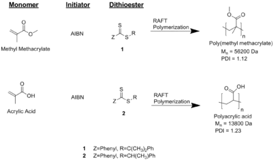 Figure 3 provides a visual description of RAFT polymerizations of poly(methyl methacrylate) and polyacrylic acid using AIBN as the initiator and two RAFT agents.