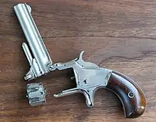 The first top-break revolver was patented in France and Britain at the end of December in 1858 by Devisme.[40] The most commonly found top-break revolvers were manufactured by Smith & Wesson, Webley & Scott, Iver Johnson, Harrington & Richardson, Manhattan Fire Arms, Meriden Arms and Forehand & Wadsworth.[41]