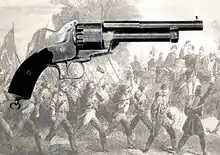 In 1836, American Samuel Colt patented a popular revolver which led to the widespread use of the revolver.[8] According to Colt, he came up with the idea for the revolver while at sea, inspired by the capstan, which had a ratchet and pawl mechanism on it, a version of which was used in his guns to rotate the cylinder by cocking the hammer. This provided a reliable and repeatable way to index each round and did away with the need to manually rotate the cylinder. Revolvers proliferated largely due to Colt's ability as a salesman, but his influence spread in other ways as well. The build quality of his company's guns became famous, and its armories in America and England trained several seminal generations of toolmakers and other machinists, who had great influence in other manufacturing efforts of the next half century.[9]