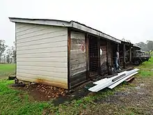 At the time of the QPF's takeover of Rewan in mid-1909, some improvements were already on site. These included a 5-room, iron-bark slab stockman's hut, suffering from white ant attack, and other out-house buildings, which were "rough and not considered of any value and should be pulled down".[34] A good stockyard was sited on a sand ridge behind the stockman's hut, which, after repair, would meet the stud's requirements for some years. Fencing consisted of about 25 miles (40 km) of outer boundaries and two horse paddocks, which were in a poor state of repair.[34][1]