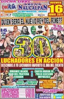 The Mexican professional wrestling company International Wrestling Revolution Group (IWRG; at times referred to as Grupo Internacional Revolución in Mexico) started their annual Rey del Ring ("King of the Ring") event in 2002, creating an annual event around the eponymous Rey del Ring match, a 30-man elimination match similar in concept to the WWE's Royal Rumble match.[2][3] From 2002 until the 2011 event the "prize" for winning the match itself was simply the prestige of outlasting 29 other competitors, but at the 2011 Rey del Ring IWRG introduced the IWR Rey del Ring Championship complete with a belt to symbolize the championship that would be awarded to the winner each year.[1] At that point in time the Rey del Ring title became a championship that could be defended and lost or won in matches in between the annual tournaments. For the tournament the champion would vacate the Rey del Ring Championship prior to the actual Rey del Ring match itself.[4] All Rey del Ring shows, as well as the majority of the IWRG shows in general are held in "Arena Naucalpan", owned by the promoters of IWRG and their main arena. The 2011 Rey del Ring was the ninth over all Rey del Ring tournament held by IWRG.