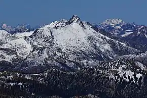 Reynolds Peak is an 8,517-foot (2,596-metre) mountain summit located in the Methow Mountains, a sub-range of the North Cascades in Washington state. It is protected by the Lake Chelan-Sawtooth Wilderness within the Okanogan–Wenatchee National Forest. Reynolds Peak has a subsidiary peak, North Peak (elevation 8,384 feet (2,555 m)), which is .3 miles (0.48 km) north of the summit. The nearest higher neighbor is Oval Peak, 8.55 miles (13.76 km) to the southeast.[1] Precipitation runoff on the east side of the mountain drains into the Twisp River via Reynolds Creek, whereas the west side of the mountain drains to the Stehekin River via Boulder Creek. Topographic relief is significant as the summit rises 3,500 feet (1,100 meters) above Reynolds Creek in approximately one mile.