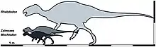 Traditionally, it has been thought Mochlodon and Zalmoxes were insular dwarfs. The smaller sizes of Mochlodon (1.6 to 1.8 m) and Zalmoxes (2.0 to 2.5 m) relative to Rhabdodon (5.0 to 6.0 m)[6] and the island locale that all three genera shared led to the hypothesis of island nanism in the case of the former two. However, Ősi et al. (2012) proposed that Rhabdodon underwent gigantism on the mainland, as opposed to Zalmoxes and Mochlodon experiencing nanism on island habitats.[3] Ösi and colleagues used femur length to estimate body size through evolution in the rhabdodontid lineage. The conclusion was that in the eastern lineage comprising Zalmoxes and Mochlodon, the size ranges of both were too close to that of the ancestral rhabdodontid to support the hypothesis of nanism. Ösi and colleagues instead came to the conclusion that Rhabdodon in the western lineage is a case of gigantism in the group Rhabdodontidae.[3]