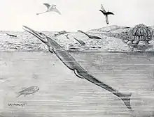 Rhacheosaurus is an extinct genus of marine crocodyliform belonging to the family Metriorhynchidae. The genus was established by Christian Erich Hermann von Meyer in 1831 for skeletal remains from the Tithonian (Late Jurassic) of Germany.[1] It was a relatively small reptile, measuring between 1.38 and 1.57 m (4.5 and 5.2 ft) long and weighing 10 kg (22 lb).[2][3]
