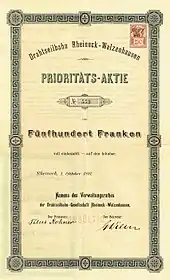 The concession for the construction of a rail link between Rheineck and Walzenhausen was granted in 1889. The Drahtseilbahn-Gesellschaft Rheineck-Walzenhausen company started construction in 1895 and the line opened on 27 June 1896. As constructed, the line was a water operated funicular railway that linked the current upper station at Walzenhausen with a lower station at Ruderbach, some 0.7 kilometres (0.43 mi) short of Rheineck station. In 1909, a connecting tram line was opened, initially operated by a gasolene powered tram and later electrified. The owning company would subsequently change its name to Bergbahn Rheineck-Walzenhausen AG.[8][9]