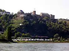 Rheinfels Castle (German: Burg Rheinfels) is a castle ruin located above the left (west) bank of the Rhine in Sankt Goar, Germany. It was started in 1245 by Count Diether V of Katzenelnbogen. After expansions, it was the largest fortress in the Middle Rhein Valley between Koblenz and Mainz. It was slighted by French Revolutionary Army troops in 1797. It is the largest castle overlooking the Rhine,[1] and historically covered five times its current area.