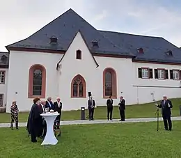 The 2020 festival had to be cancelled due to the COVID-19 pandemic.[14] The 2021 festival was opened on 26 June, traditionally by the hr-Sinfonieorchester, and as the last program with Orozco-Estrada.[14] Due to restrictions, the 650 listeners were placed like a checker board, 2 seats taken, and 2 seats empty; the program was played without intermission.[15][16] Augustin Hadelich was the soloist in the Violin Concerto by Jean Sibelius, which was followed by Mendelssohn's Reformation Symphony.[14][17] The concert was at the same time a charity concert of President Frank-Walter Steinmeier who spoke at the beginning with a focus on the support and encouragement of music students to follow their calling even in critical times.[14][15] After the concert, he invited to a reception at various areas of the property, addressing each group there.[16]