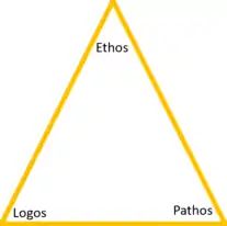 Aristotle established the classic triad of ethos, pathos and logos (the Aristotelian triad of appeals) that serves as the foundation of the rhetorical triangle.[6] The rhetorical triangle evolved from its original, sophistic model into what rhetorician Sharon Crowley describes as the "postmodern" rhetorical triangle, the rhetorical tetrahedron.[7] The expanded rhetorical triangle now emphasizes context by integrating situational elements.