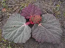 Rheum[2] is a genus of about 60 herbaceous perennial plants in the family Polygonaceae. Species are native to eastern Europe, southern and eastern temperate Asia, with a few reaching into northern tropical Asia. Rheum is cultivated in Europe and North America.[1] The genus includes the vegetable[3] rhubarb. The species have large somewhat triangular shaped leaves with long, fleshy petioles. The flowers are small, greenish-white to rose-red, and grouped in large compound leafy inflorescences. A number of cultivars of rhubarb have been domesticated both as medicinal plants and for human consumption. While the leaves are slightly toxic, the stalks are used in pies and other foods for their tart flavor.