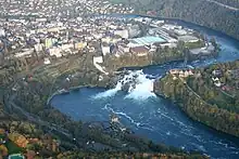 listen), a singular noun) is a waterfall located in Switzerland and the most powerful waterfall in Europe.[2][3][1] The falls are located on the High Rhine on the border between the cantons of Schaffhausen (SH) and Zürich (ZH), between the municipalities of Neuhausen am Rheinfall (SH) and Laufen-Uhwiesen/Dachsen (ZH), next to the town of Schaffhausen in northern Switzerland.