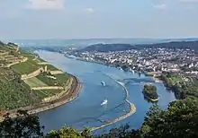 The Upper Rhine again changes its flow direction from west to north at another bend near the German town of Bingen and the mouth of the Nahe tributary. Coming here from the city of Mainz, parallel to the crest of the Rhenish Massif, the turn to the north at Bingen marks the opening of a water gap between the Hunsrück mountain range in the west and the Taunus in the east, stretching up to Koblenz in the north and separating the Upper from the Middle Rhine.