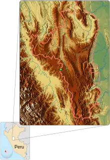 | The green dot corresponds to where the holotype was found and the red lines are the boundary of the Cordillera Azul National Park. | |