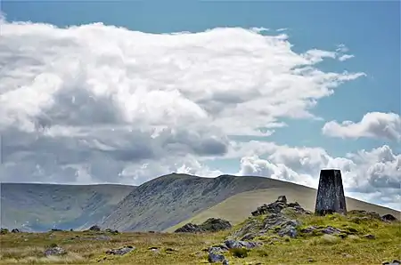 'Rhinns' derives from the Old Irish rind, later Ulster Irish and Scottish Gaelic rinn, meaning 'promontory' or 'point'.[24] 'Kells' is a parish in the historic county of Stewartry of Kirkcudbright to the southeast of the range near New Galloway. Its name possibly derives from the Old Irish cell, later Irish and Scottish Gaelic cill, meaning 'church',[25] but may instead be in reference to its heightened elevation or, historically, wooded land.[26] Most of the hill names are of Scottish Gaelic or Scots origin, such as Meikle Millyea; (Scots: meikle - 'large') (Scottish Gaelic: meall liath - 'grey, round hill'), which translates fully to 'large, grey, round hill'.[27]