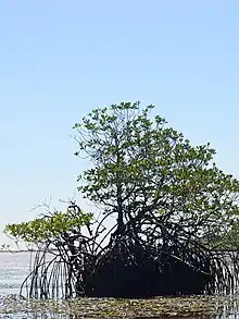 Stilt roots are lateral roots that originate from the base of the stem downwards into the substrate. Another very common type of root possessed by R. apiculata is stilt roots that act as an additional support and anchor.[11] The location of the R. apiculata will determine the type of effect placed onto the stilt root for instance; if the stilt root grows downward and finds water then it will continuously grow downwards until soil from the ocean floor or it meets a substrate it can grow around. If the stilt root reaches soil first it will grow underground expanding the root system then grows additional stilt roots from the original that grew unilaterally upwards.[12] This process is necessary for the plant to increase carbon sequestration alongside providing additional stability from being uprooted. Including R. apiculata there are a variety of mangrove plants that possess stilt roots for instance R. mucronata, and R. stylosa.[12]