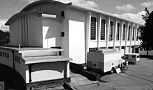 A single storey building housed offices, a canteen and kitchen; a secretarial/administrative office (two ladies) and a reception area. The heart of the building was dwarfed by the two-storey high studio block. An outdoor prefabricated canteen building was erected in 1976 and at the rear of the building a concrete ramp led to the engineering workshop, another prefab construction. Adjacent to the studio, a props room housed programme sets, advertising materials and other sundries.