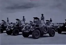 Although maligned by age and further deteriorating as a result of hard use and the difficulty in obtaining spares from the United Kingdom, Ferrets continued to be employed for counter-insurgency operations and protective duties.[5][23] Equipped with a single heavy machine gun, Browning medium machine guns, or a 20mm Hispano-Suiza HS.820 anti-aircraft gun, they were retrofitted with new motors and larger fuel tanks.[3] RhACR units also used MAP-45 and MAP-75 armoured personnel carriers, which, although lightly armed and armoured, provided excellent protection for their embarked infantry sections against land mines. Local manufacturers either converted an older chassis into a MAP or created an entirely new one, installing engines stripped from a menagerie of imported commercial vehicles.[5]