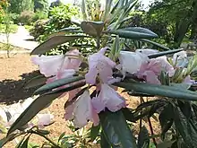 Rhododendron insigne (不凡杜鹃) is a rhododendron species native to southern Sichuan in China, where it grows at altitudes of 700–2,000 m (2,300–6,600 ft). This evergreen shrub grows to 1.5–6 m (4.9–19.7 ft) in height, with leathery leaves that are obovate-elliptic, obovate-lanceolate, oblong, or oblong-lanceolate, 8–13 by 2.5–4.5 cm in size. The flowers are pale to dark pink.