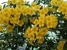 Rhododendron laetum is a rhododendron species native to the Anggi Lakes area of the Arfak Mountains in Indonesia and western New Guinea, where it grows at forest edges, in open marsh, and in swamps at the edge of lakes. This evergreen shrub grows to 3 m (9.8 ft) in height, with leaves that are broadly elliptic or sub-ovate-elliptic, 40–95 × 25–53 mm in size. The flowers are deep yellow, flushing with red or orange as they age.
