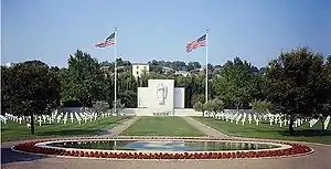 The cemetery, created 19 August 1944, has headstones arranged in straight lines, divided into four plots, and grouped around an oval pool. Small gardens are placed at each end of the cemetery which is overlooked by a chapel. Within the chapel are decorative mosaics, murals (by Austin M. Purves Jr.) and sculptured figures.[6] Between the chapel and the graves, a bronze relief map details US military operations in the region. On a wall of the terrace, 294 names of those missing in action are inscribed (rosettes mark those since recovered and identified).