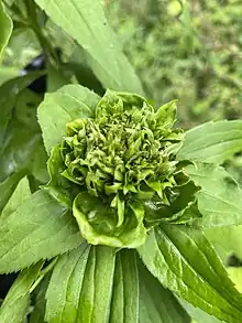 Pupae of the spring galls emerge from mid to late May and induce the much slower-developing summer-generation galls that have several wide leaves surrounding dozens of densely packed, smaller leaves, giving the gall a shape of a sunflower. The summer galls contain 6-20 white, conical chambers, and larvae of R. capitata are heavily attacked by parasitoids. Some shoot tips can support larvae of both species at the same time, resulting in galls with morphological attributes of both species, and ectoparasitoids are found feeding on the larvae and pupae of the gall inducer.[1][2]