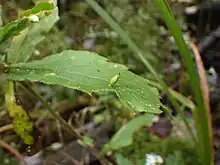 The galls are small, conical, and single-chambered, and typically occur on the lower side of leaves but sometimes on the upper side of leaves and on stems. Each gall contains a single white larva and is attached to either a major or minor vein when on leaves. On Solidago rugosa, the galls are 2.5–6 mm (0.10–0.24 in) long and .7–1.2 mm (0.03–0.05 in) wide at the widest part, tapering toward the apex, green to yellowish green, and covered by short, whitish hairs. Young galls may sometimes have a tuft of hair at their base, almost as long as the gall itself. [1]