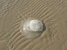 Rhopilema nomadica, the nomad jellyfish, is a jellyfish indigenous to tropical warm waters of the Indian and Pacific Oceans. Since 1970's it has been also found in Mediterranean Sea, where it entered via the Suez Canal (Lessepsian migration). It has been found in the Eastern Mediterranean,[1] off the coast of Lebanon, Israel, Turkey, and in the Aegean Sea off the coast of Greece.[2] R. nomadica's body is light blue and the bell is rounded. It can grow up to 10 kg of weight, and its bell is commonly 40–60 cm in diameter, but can be up to 90 cm. The European Union lists it as one of the worst invasive marine species in European waters.